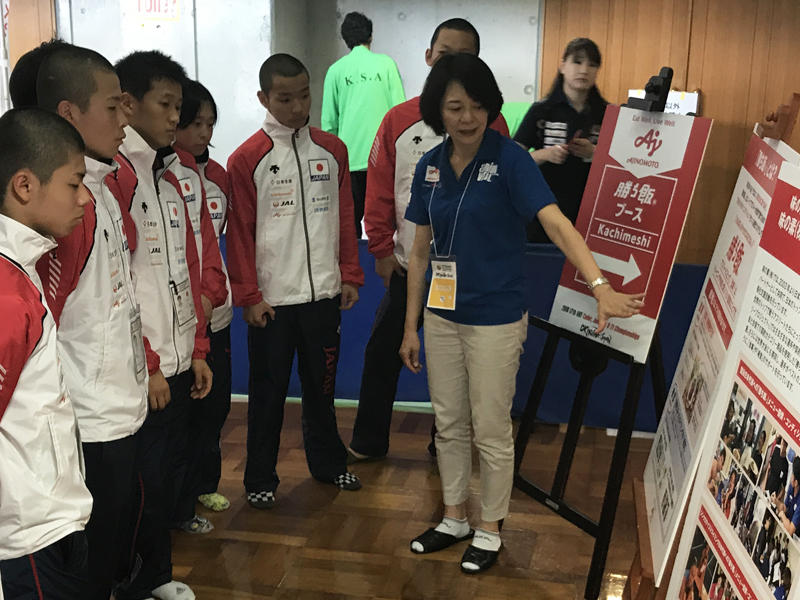 会場内の「勝ち飯®」ブースでは、観戦者や各国選手が説明展示に足を止める中、開会式で見事な特別演舞を披露した喜友名諒選手、金城新選手、上村拓也選手も立ち寄り、ファンと交流するなど、常に賑わいを見せていました。